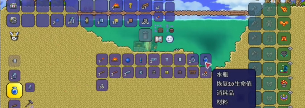 水瓶是绝大多数药水的合成基底材料,像治疗药水和铁皮药水都需要它。直接使用瓶装水可以立即恢复20点生命值,但会触发90秒耐药性减益,期间药水恢复效果减半,而且使用后不会返还空玻璃瓶。为了提升药水制作效率,你可以将空玻璃瓶放置于平台如木平台、桌子或工作台上生成炼金台,炼金台制作药水时有几率不消耗材料,能节省珍贵资源。