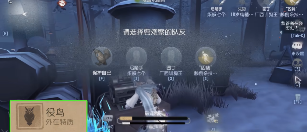 角色强度高并不意味着其操作门槛低。先知的技能机制要求玩家具备一定的游戏基础与操作技巧。其核心技能役鸟的使用并不仅仅是简单的点击施放,玩家需要在牵制监管者时,将视角转向后方以积累额外的使用次数,这个过程被称为吸鸟。这一操作对于不熟悉地图布局、视角转动和走位配合的新手玩家而言,存在相当的难度,容易因看后方而导致撞墙或转错方向。