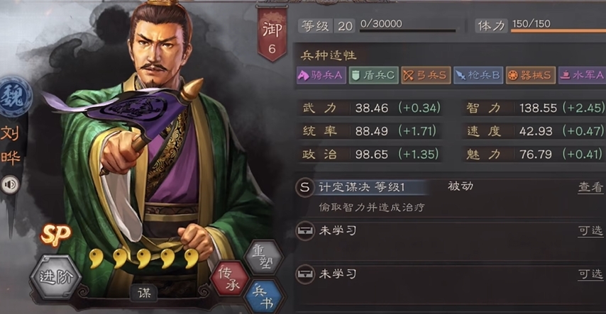 刘晔是一位以高智力属性为核心的武将,其定位非常明确,无论是四星版本还是SP版本,高智力都让他能胜任队伍中的核心输出或关键辅助角色。他的基础智力属性出色且成长空间大,属于培养价值较高的武将,尤其是在游戏前期或缺少顶级智力将的情况下。四星刘晔的自带战法通常为料事如神或风声鹤唳,这是一个主动战法,能对敌军群体两人造成受智力影响的谋略伤害,并同步降低敌方造成的兵刃与谋略伤害,持续两回合,该战法兼具输出与团队减伤,在开荒及中期对抗高输出阵容时效果关键。SP刘晔的自带战法则为计定谋决,这是一个被动战法,战斗开始时即可生效,能稳定偷取敌方智力最高武将的大量智力属性,且每当自身试图发动主动战法前,能为我军单体恢复兵力,这个机制使他同时具备削弱对手与治疗队友的双重能力。