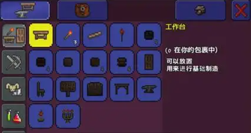 首先咱们需要知道工作台是游戏里最基础的工具台,没有它可没法做大多数物品。开局直接砍树就能获得木材,打开背包界面用10个木材就能徒手合成一个基础工作台。记得把工作台放在地上才能使用,靠近它时背包里会多出更多可制作的物品列表。工作台放好后不需要