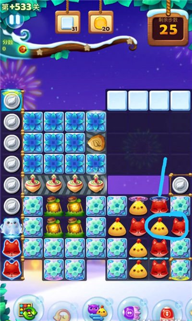 开心消消乐588隐藏关需在限定步数内完成点亮全部魔法石、清除所有雪块的双重目标,核心策略是从左侧开局破冰、优先合成特效联动、分步突破右侧厚雪区,精准把控每一步消除效率即可稳定通关。关卡整体呈左右分割布局,左侧初始可消除空间较大,右侧被多层雪块与银币密集封锁,魔法石分散在中下区域,被障碍层层包裹,直接消除难度极高。开局必须从左侧入手,利用基础三消逐步破除表层雪块,优先打通中下区域的下落通道,让动物元素自然掉落聚集,为合成特效创造条件。初期避免盲目点击右侧,每一步都要围绕扩大可操