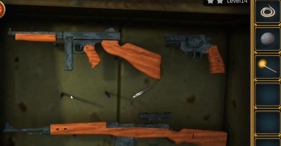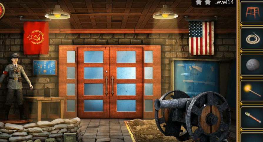 进入第14关后,首先需要收集场景中的关键道具。在军人右边的桌子上可以拿到手棒和火柴盒,点击正中间的椅子以及军人肩上的绳子获取它们。接着查看军人脚下,会发现一个黑色铁球和一根火柴,将这些物品全部收入道具栏。需要注意场景左侧国旗下方放有武器的柜子,使用手棒砸开玻璃,能获取里面的弹夹和小刀。