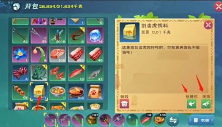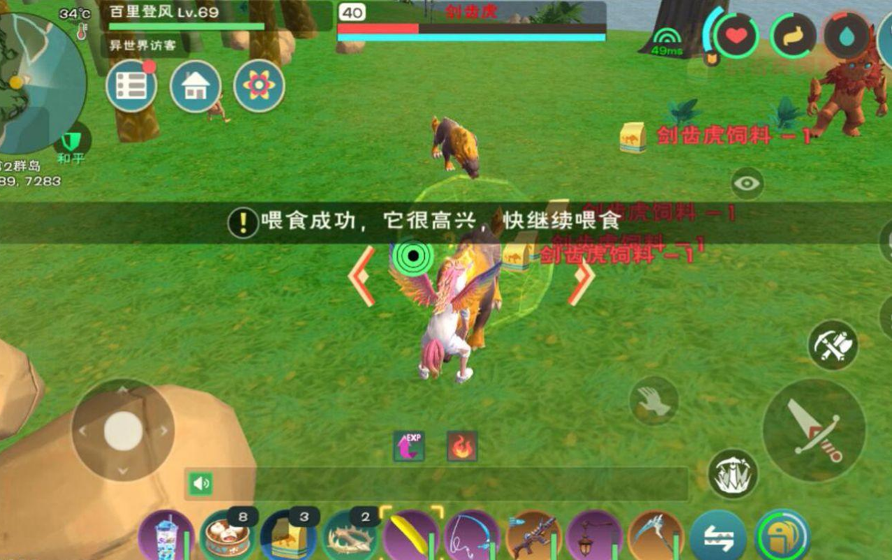驯服剑齿虎王,你得先准备好它的饲料。饲料配方是小龙虾、牛肉和优质肉,保底需要18包才能成功驯服。小龙虾可以在仙女河钓到,牛肉通过击杀牛获得,优质肉则需要击败蜥蜴、熊或者剑齿虎才有几率掉落。记得提前收集足够的材料,避免找到剑齿虎王时手忙脚乱。建议带上足够的捕捉器和木棒,先用武器把它的血量打到三分之一以下,再用木棒敲晕,最后喂食饲料直到出现爱心标志,就能成功捕捉了。