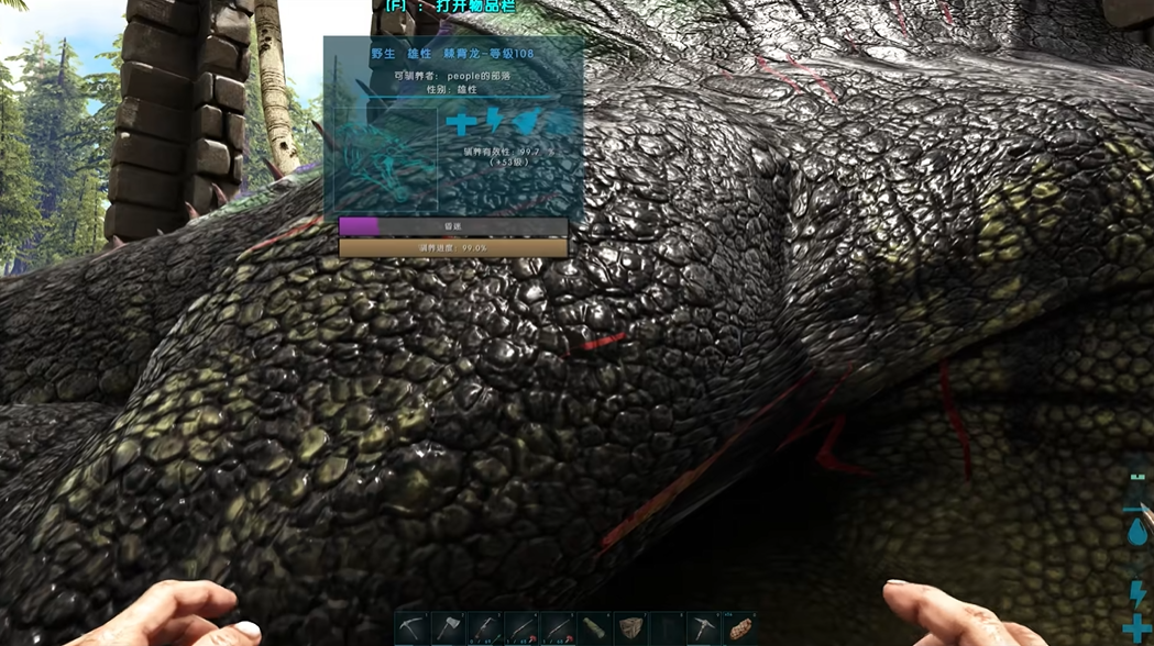 击晕棘背龙后,需立即打开其物品栏并放入准备好的饲料。驯服过程中需持续监控棘背龙的眩晕值,适时补充麻醉药以维持其昏迷状态。棘背龙的驯服进度增长较慢,因此需要耐心等待。在此期间,需警惕周围可能出现的其他食肉生物,避免干扰驯服过程。