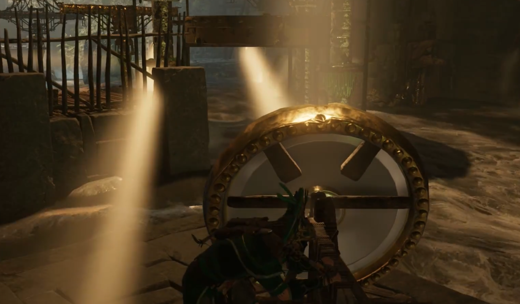 太阳神庙的镜子谜题要转动四面镜子反射阳光,先操作1号镜子左转对准绿色标记,再爬到2号平台调整角度。中间平台下降后,记得用绳索箭矢连接摇摆的垃圾堆,借助风力撞击障碍物开路。审判凝视古墓的梯子谜题分三步:拉动滑车升起重物,连接小神像与梯子左侧,最后用自身重量降下重物让梯子完全立起。