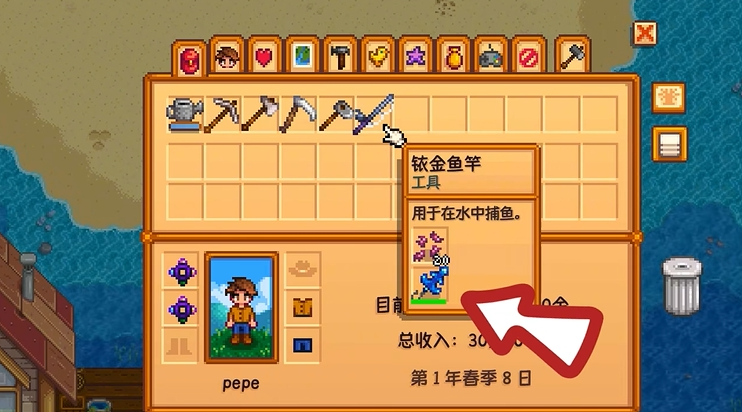安装钓具的前提是必须拥有铱金鱼竿,其他低级鱼竿如竹钓竿或玻璃纤维竿无法实现这一功能。铱金鱼竿需要玩家钓鱼等级达到6级后,在威利的渔具店花费7500金币购买。购买后,打开背包界面,左键选中钓具,再右键点击铱金鱼竿即可完成安装。需钓具和鱼饵的安装方式相同,但铱金鱼竿是唯一能同时容纳两者的鱼竿。