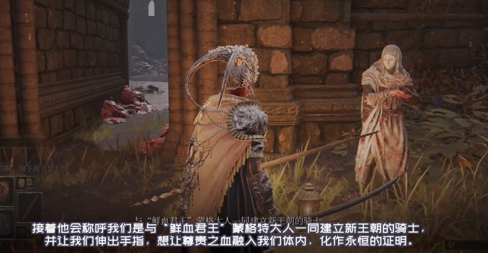 如果选择支线任务的方式,咱们需要先找到白面具梵雷。他最初会在引导之始赐福点附近出现,打完接肢葛瑞克后,他会移动到湖区的蔷薇教堂。和他对话后,他会给几个溃烂血指让咱们去入侵其他玩家,其实输赢无所谓,只要完成三次入侵再回去找他,就能拿到染血的白布。接着咱们需要去四钟楼传送回出生点,那里有一具女巫尸体,用白布沾染她的血后回去交任务,就能获得纯血骑士勋章,使用后直接传送到鲜血王朝。