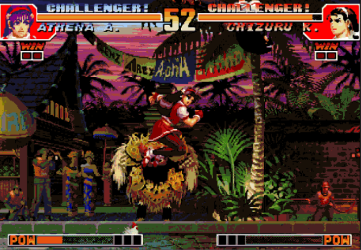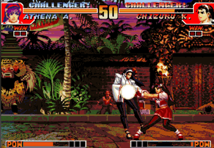 从视觉表现来看,麻宫雅典娜的战斗动作设计极具观赏价值。必杀技闪光水晶波释放时的粒子特效,以及超必杀凤凰之箭的全屏动画效果,都展现出SNK在角色美术设计上的功力。这种视觉表现与操作简易度的结合,使其成为兼顾实用性和观赏性的典型代表。