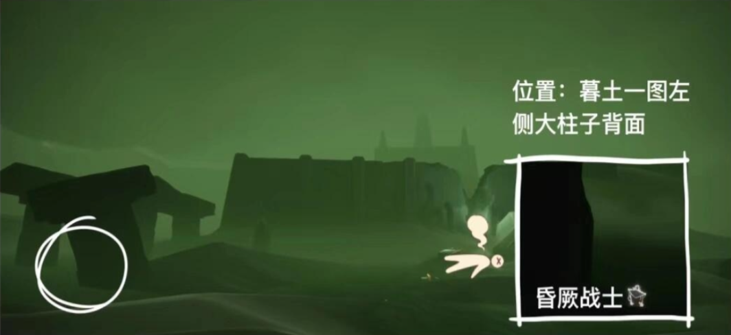 获取趴倒地动作的关键在于找到隐藏的先祖。进入暮土第一场景后,面向城堡大门向左移动,可以看到一根明显的柱子。玩家需要绕到柱子背面,这里有一个被柱子遮挡的隐藏先祖。由于位置较为隐蔽,建议玩家仔细搜索柱子周围区域,注意观察蓝色光芒的提示。找到先祖后,通过跟随记忆解锁动作是标准流程。