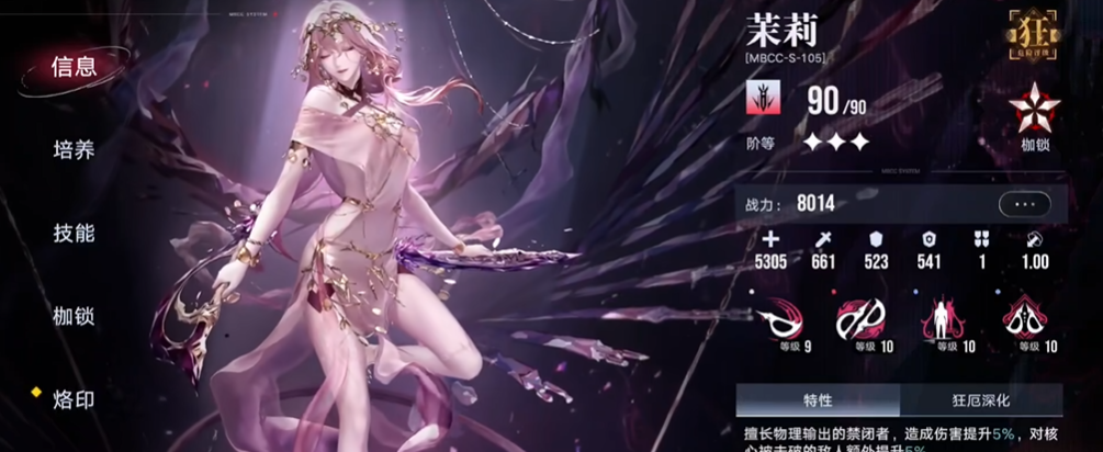 法术伤害方面萨妮凭借必杀技造成大量法术伤害和核心伤害,同时提高能量回复速度,确保技能释放频率。她的被动技能增强法术输出,尤其是在命中高血量敌人时伤害显著提升,使用局长权能后还能进一步增强回复,循环流畅。来生泪作为联动角色,具备核心伤害和团队增益能力,必杀对范围内敌人造成法术伤害与核心伤害,并附加标记,持续期间通过力场造成额外伤害和控制,有效应对集群敌人。物理伤害角色中茉莉通过普攻和必杀附加生命流逝状态,造成持续物理伤害,同时提升全队流血效果的持续时间和伤害。她的专属烙印进一步强化在场时的输出,敌人每携带一种不同来源的流血状态,就会使其受到的物理伤害提高,进一步放大团队伤害潜力。