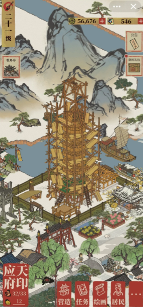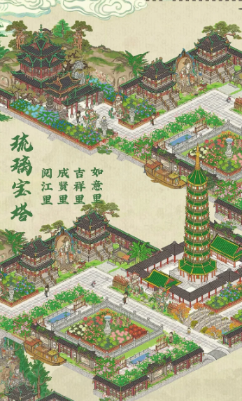 琉璃塔是应天府的一座标志性建筑,位于地图左上方显眼位置,最初呈现为半成品状态。玩家需要先通过探索任务解锁塔周围的地块,通常在完成特定任务后,才能在探索中找到建造大报恩寺琉璃塔的选项,之后通过升级逐步完成建造。