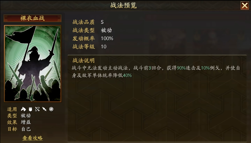 当前版本中,马超的优选战法组合包括裸衣血战与血刃争锋。裸衣血战能提供前三回合的连击状态与物理吸血,是爆发期的保证;血刃争锋则可以大幅提升普通攻击的伤害,与马超的群攻状态完美契合。若无上述战法,传统的强攻搭配瞋目横矛或一骑当千也是可行的思路,强攻提供连击,瞋目横矛能额外增加武力并附带群攻,而一骑当千则是在普攻后对敌军全体造成高额兵刃伤害的突击战法。为了应对盛气凌敌等缴械控制,携带虎踞鹰扬来获得免疫效果是保障输出稳定性的重要手段。战法点的投入应优先保证其自带战法槊血纵横,其次是核心的连击与增伤战法。