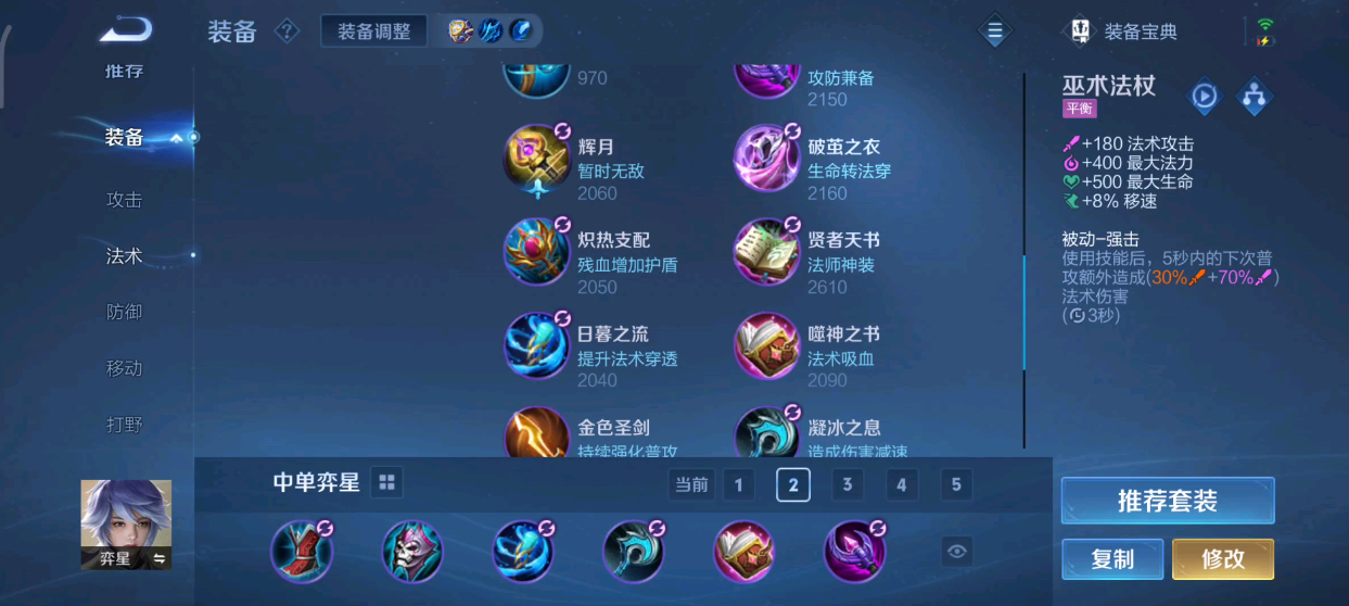 一套兼顾冷却与爆发的通用方案为冷静之靴、回响之杖、博学者之怒、虚无法杖、辉月与噬神之书或贤者之书。冷静之靴是前期核心,它所提供的冷却缩减能让弈星更频繁地释放一、二技能储存棋子并消耗敌人,其被动名刀效果也增强了生存容错。回响之杖提升移速与技能爆发伤害,有助于弈星快速游走支援。博学者之怒大幅提升法术强度,是伤害质变的关键装备。当敌方英雄法术防御成型时,虚无法杖提供的百分比法术穿透至关重要。辉月能在关键时刻规避致命伤害和控制,为团队创造反打机会。最后一件装备可根据局势选择,需要续航则选噬神之书,追求极致伤害可出贤者之书。若敌方治疗能力强,中期可将回响之杖替换为梦魇之牙。