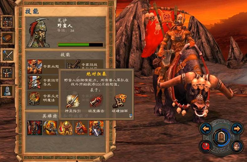 英雄通常需要达到26级左右才能积累足够的技能点来满足所有前置条件,在实际游戏中由于技能出现概率的随机性,往往需要更高的等级。终极技能绝对狂暴与兽族的血怒机制高度契合,它能够瞬间激活食人魔狂化、独眼巨人投掷等依赖怒值的技能,配合半人马掠夺者和屠杀者的高主动性,可以形成压制性的开局优势。这一技能尤其强化了兽族以攻代守、速攻压制的核心战术思路,但它对飞龙兵种无效,并且在面对拥有强制幸运一击等特定技能的敌人时,其效果可能会被部分抵消。