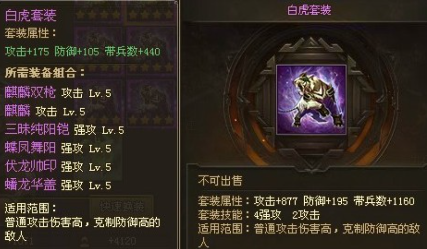 游戏后期,顶级真系列套装是追求极致战力的最终目标,它们通过合成基础或中级套装获得,属性获得飞跃式提升。真霸下套装由玄武和霸下套装合成,拥有极高的防御和血量,堪称套装里的泰山北斗,能让关羽、周泰成为几乎无法撼动的坚固壁垒。真烛龙套装合成自青龙和烛龙套装,提供了高额血量、优秀的双防和突出的战法伤害,是像关羽、张飞这类全能型武将的毕业装备之一,推图和武斗都游刃有余。真驱虎套装则继承了白虎套装的攻击特性并将其升华,将强大的魔法伤害与物理输出完美结合,能给佩戴者带来让对手胆寒的爆发能力。