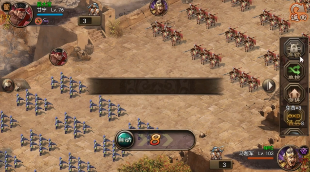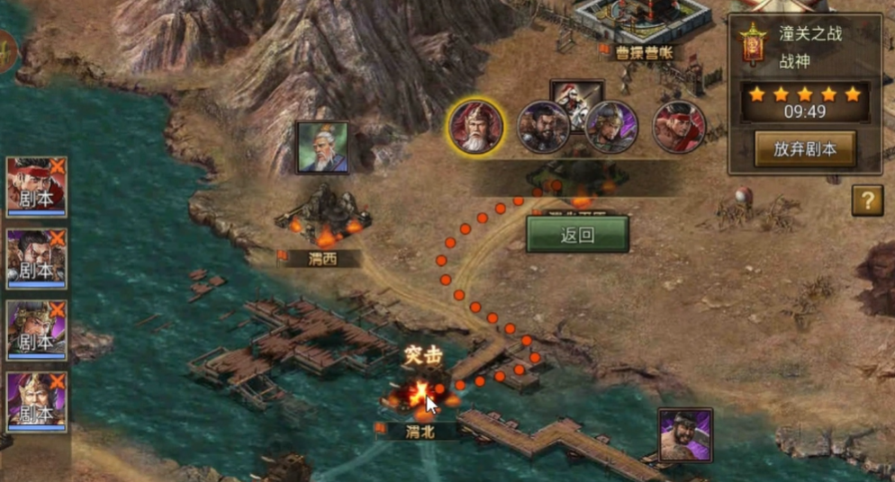 战斗开启后直接选择左路推进,路线固定为八重山—巴梯—麻姑山—伊奇麻—兼城水域,每座城池先由每个账号投放10个陷阵营稳住防线,再补充500个普通幻影,同步开启血战消耗NPC战法,水域城池优先选用甘宁武将,山地与城池多用夏侯惇、周泰,保证兵种与地形适配提升战力。抵达兼城水域后立即使用突进技能,快速包围五城行宫区域,五城周边三座护城每城投放800个普通幻影,先进行5分钟单挑消耗NPC主力,再投放虎豹骑强化输出,每人预留10个虎豹骑用于后续关键突破,避免前期过度消耗特殊幻影。