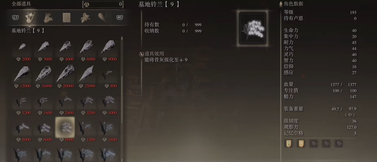 骨灰的强度与玩家属性成长息息相关。集中力属性直接影响可召唤骨灰的FP消耗上限,建议前期将集中力提升至20左右以支持高阶骨灰的使用。骨灰强化材料墓地铃兰需优先收集,早期可在风暴山丘的墓地和地下副本中大量获取。强化后的骨灰能显著延长存活时间并提升伤害,是开荒阶段不可忽视的资源规划重点。
