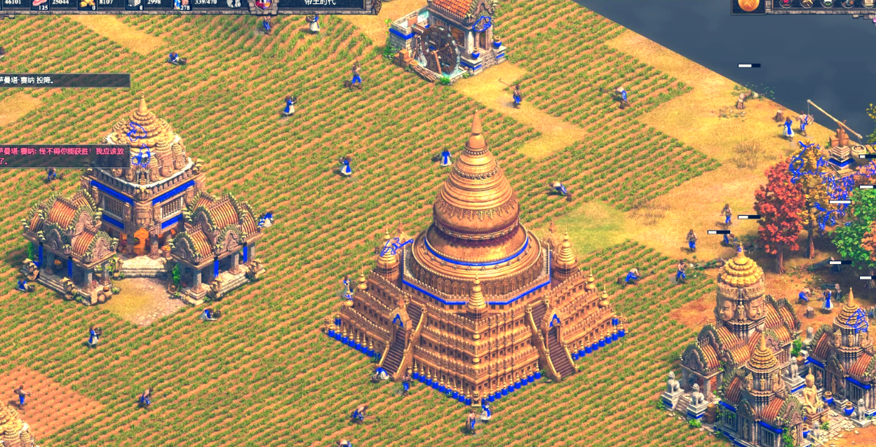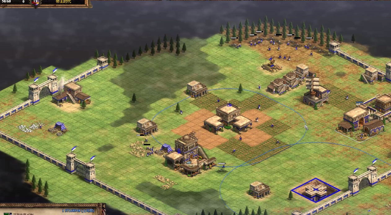 种田是获取食物资源的核心手段,直接影响经济发展和军事扩张的节奏。合理规划农田布局是首要任务,建议围绕磨坊或城镇中心布置8块农田,形成紧凑高效的采集圈。这种布局能减少农民移动距离,同时便于集中升级相关科技。初期不宜过度扩张农田数量,避免木材资源过早枯竭,应保持与其他资源采集的平衡。
