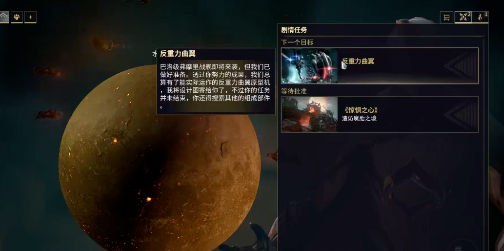任务激活后,玩家需要前往金星执行一个挖掘任务来获取反重力曲翼的设计图。在挖掘地点,玩家必须保护挖掘机免受敌人攻击,并从附近的无人机收集电池以维持挖掘机的能量。成功完成一次挖掘后,系统会奖励玩家设计图,此时建议立即撤离以节省时间。