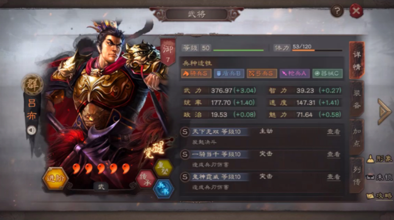 给吕布减伤最直接有效的一个办法,就是给他配上有保护能力的辅助武将。这里头有几个特别好用的御用工具人。比如郭嘉,他的自带战法十胜十败能给主将提供前两回合的洞察效果,就是免疫所有控制,最关键的是还能让主将受到的伤害降低百分之五十。你想啊,吕布最