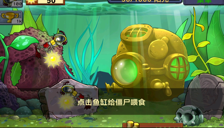 水族馆是一个以喂养和经营为核心玩法的小游戏关卡,你的核心目标是喂养僵尸,让它们存活并生产阳光,最终积累足够数量的阳光来购买奖杯即可通关。游戏开始后,场景就像一个大型鱼缸,你需要通过点击屏幕来放置食物喂养僵尸。食物主要是脑花蛋糕,每放置一个会