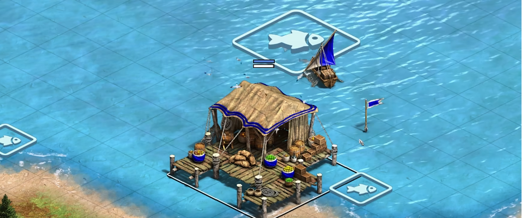 养鱼场是海洋地图中重要的食物来源,咱们需要先用渔船建造它。渔船在码头生产,消耗木材,记得提前储备资源。建造时,点击渔船的建造养鱼场图标,选择靠近基地的浅海区域放置。养鱼场会提供700食物,但采集速度较慢,适合作为补充资源而非主力来源。建造完
